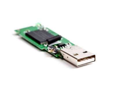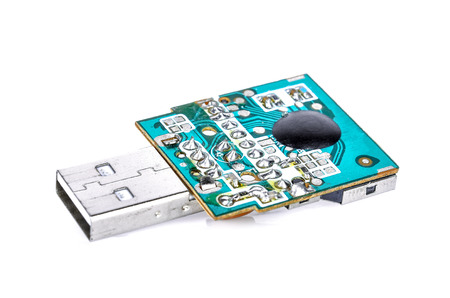 USB circuit board, Macro closeup Green Motherboard isolated on white background, electronic circuits, semiconductor transistor technology, microchip graphic card, selective focus, shallow depth of field