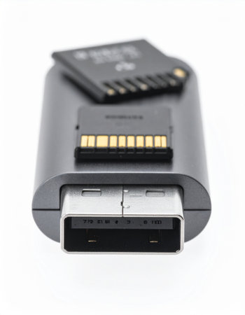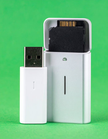 Essential tools for the modern digital workflow, this sleek white USB flash drive and SD card reader stand ready to transfer and secure your valuable data.