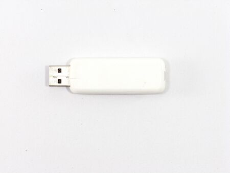 This image features a sleek white USB flash drive on a neutral background, showcasing its minimalist design and modern technology fit for professional presentations.