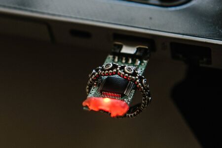 Usb Flash drive on the laptop keyboard.Dark image shot.