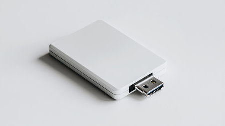 A single, modern USB drive rests on a clean, white surface, its sharp shadow hinting at the importance of the digital information it holds.