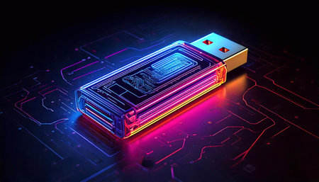 A flash vibrant drive shines with neon colors while resting on a dark circuit board background