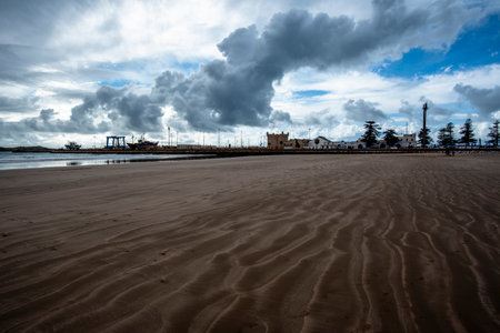 beautiful view of the huge beaches of Essaouira on the Atlantic Ocean with the port and the yellow sand the blue sky dotted with white clouds in Morocco