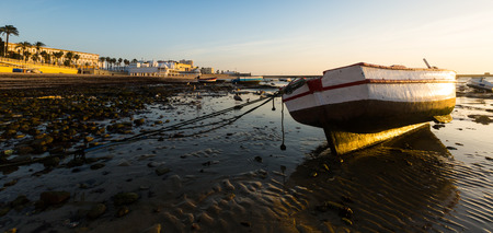 Caleta Beach with boats in sunny sunrise time. Cadiz, Spain