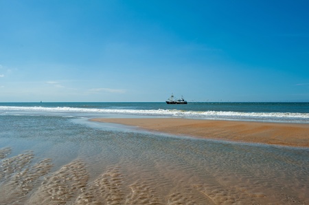 Trawler fishing at sea under a blue sky