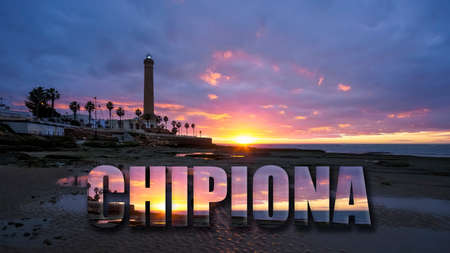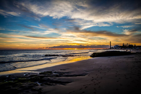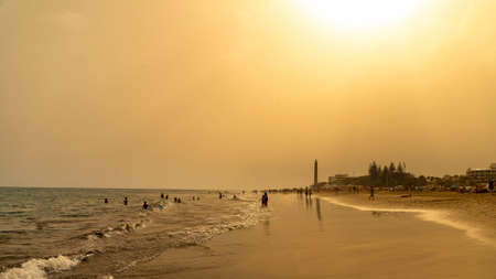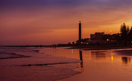 Beautiful sunset view on the beach with lighthouse in Maspalomas city on Gran Canaria island