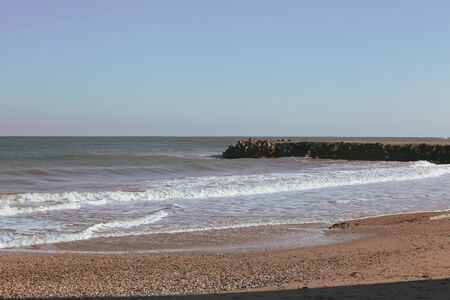 Seascape with pier and stones on clear sky at background in Catalonia, Spain