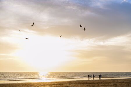 silhouette of a group of unrecognizable people walking on the beach in summer at sunset, the seagulls fly through the sky, concept of relaxation at summertime