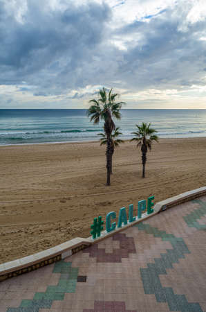 CALPE, SPAIN - JANUARY 24, 2022: Sign in Calpe with the name of the city, with the beach in the background, Alicante province, Valencian Community, Spain