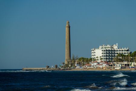 Maspalomas, Spain - Jan 5, 2012: Maspalomas lighthouse is very clear visible against a clear blue sky. Blue water with white foam heads.