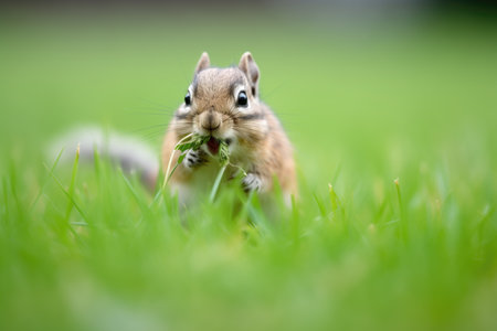 Chipmunk on green grass in the park. Shallow depth of field.