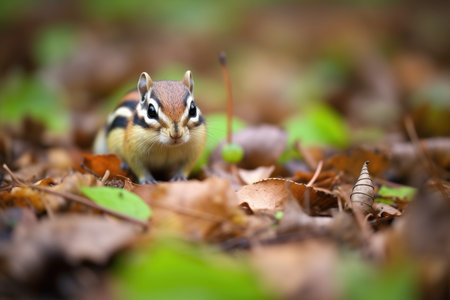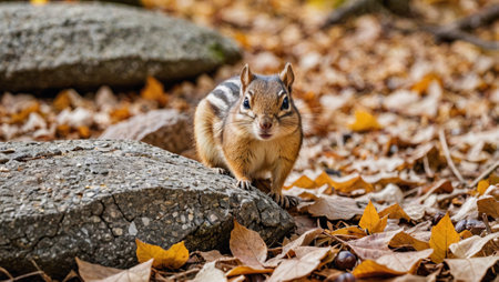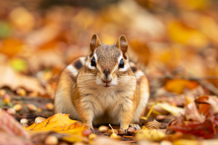 chipmunk foraging for seeds among autumn leaves