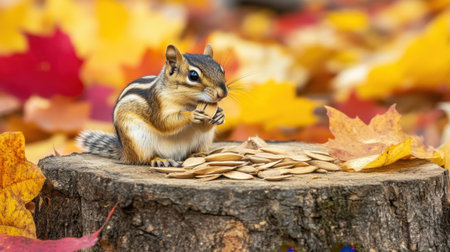 A charming chipmunk is perched on a tree stump, savoring seeds amidst a vibrant carpet of colorful autumn leaves, showcasing nature's beauty.