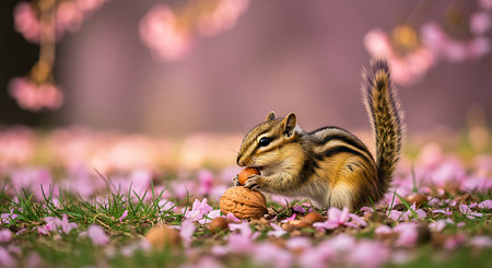Chipmunk eating nut on cherry blossom petals background.