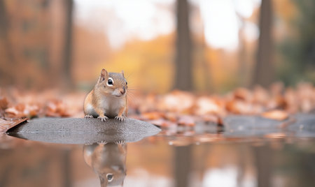 A chipmunk sits on a puddle in the fall.