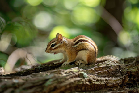 Chipmunk perched on sunlit forest log among green bokeh