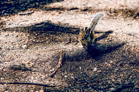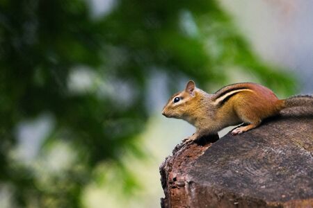 Small cute wild fluffy chipmunk rodent running in habitat in the forest in summer