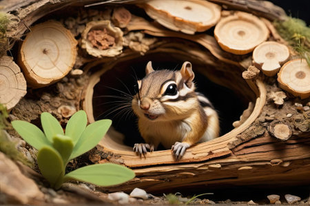 A small chipmunk with distinctive stripes curiously peeks out from a cozy wooden burrow made of tree bark and logs. The surrounding environment features green plants, enhancing the natural feel of this idyllic scene captured in daylight.