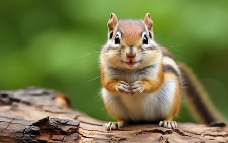 Cute chipmunk sitting on a log in the forest.