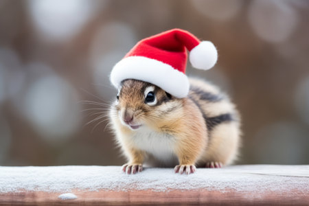 Portrait of an adorable festive Christmas chipmunk wearing a Santa hat in a winter landscape