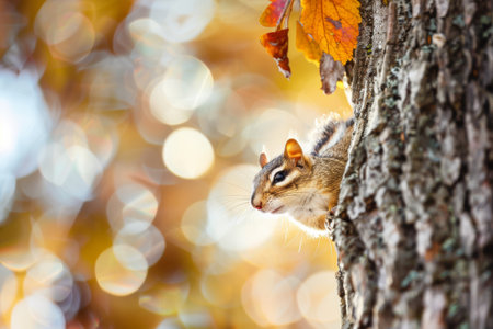 photo of a playful brown and white chipmunk peeking out from the side of a textured gray oak tree, autumn leaves creating a soft bokeh effect in the background, hyperrealism, 55mm --ar 3 2 --style raw --stylize 20 Job ID ad8a4f17 -c6fc-4c3f-9333-c8bfe0f44ab2