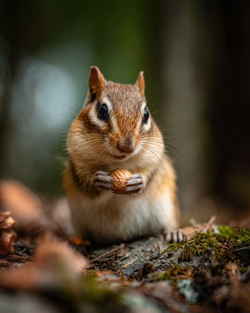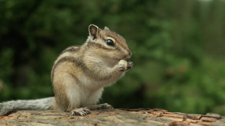 a Chipmunk eats a nut in a forest in the taiga.
