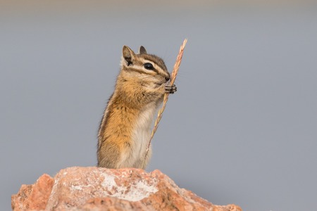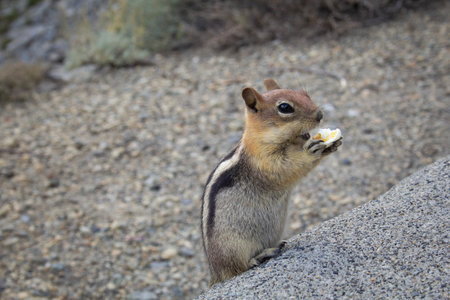 Chipmunk eating food on a rock in Yellowstone National Park, Wyoming