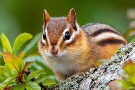 Chipmunk standing on a branch with lichen and green leaves in natural habitat