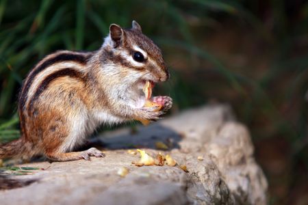 Chipmunk eating grass grain on a rock