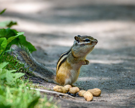 a small chipmunk is sitting on the path, nuts are lying next to it, close-up