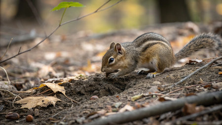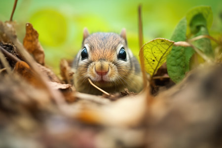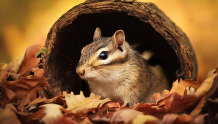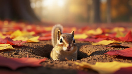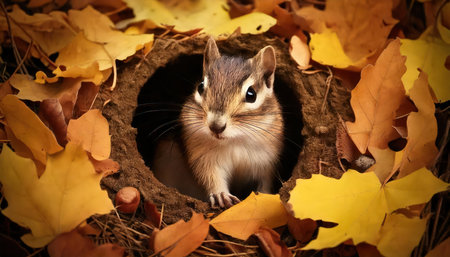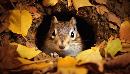 Chipmunk peeking from burrow, autumn leaves, forest floor.