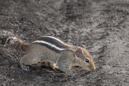 Closeup of an Indian palm squirrel three striped squirrel searching for the food. Gilhari an Indian Palm Squirrel Northern Palm Squirrel or Chipmunk in a Natural Outdoor Environment.