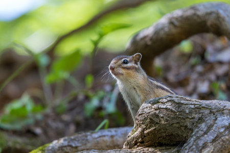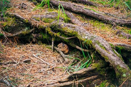 Small cute wild fluffy chipmunk rodent running in habitat in the forest in summer