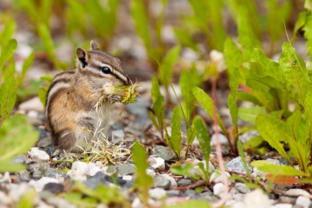 Cute little Least Chipmunk Tamias minimus foraging between green plants for dandelion buds