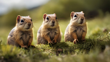 Three golden mantled ground squirrels sit in the grass. They look alert and curious, a charming wildlife scene captured in nature's embrace.