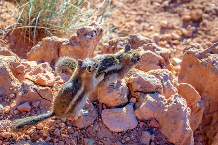 a younger male chipmunk following a mature female, created with generative ai