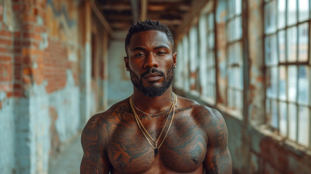 Handsome african american man with tattooed body posing in abandoned factory.