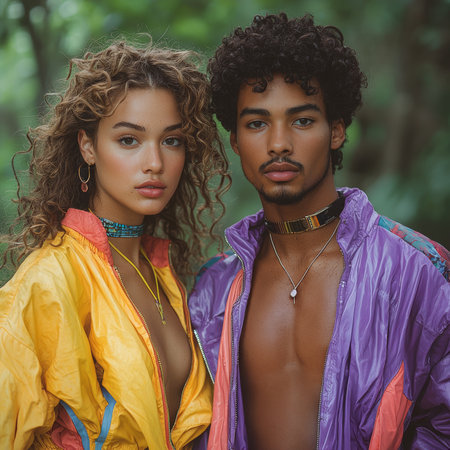 A young man and woman showcase confidence and style in colorful, sporty jackets. Their fashionable look reflects a retro 80s vibe, highlighting bright colors and vibrant energy in a natural setting.