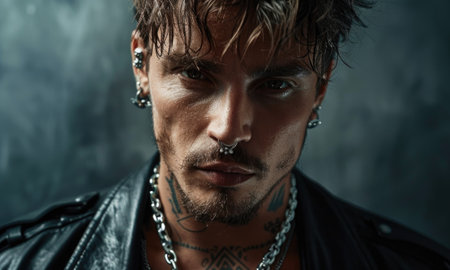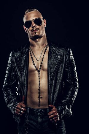 Dark portrait of a serious punk man wearing black leather jacket.