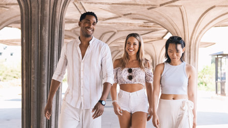 Happy friends walking in colonnade structure at city