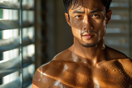 A shirtless man is standing in front of a window, his silhouette highlighted by the natural light pouring in. He gazes outside, his muscular frame visible against the backdrop of the window.