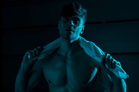 sexy shirtless man holding towel and looking at camera in darkness