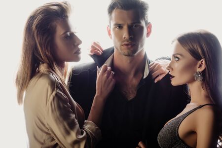 Three young sexy people of handsome bearded muscular macho man touching two sensual attractive girls lovers with beautiful body and naked chest close to each other indoor, horizontal picture
