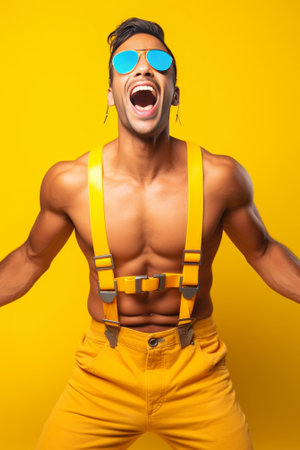 Generative AI : Happy drag queen smiling at camera on a yellow background Trans man celebrating gay pride day Lgbt community concept