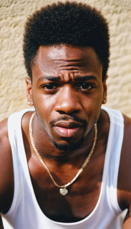 photo of black person man with white tank top in neighborhood ,generative AI