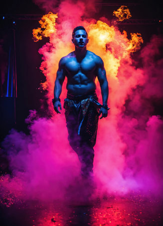 Beautiful young man with colorfull hair in colorful smoke. ai generative.