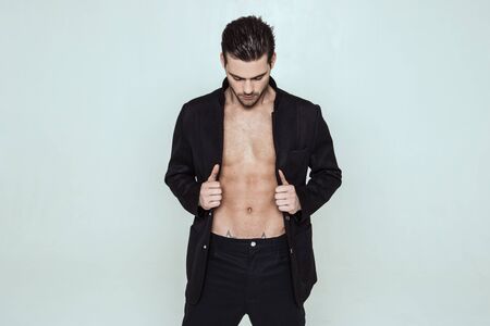 Muscle strong beautiful stripped male model in black toxedo and black trousers on grey isolated font background