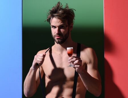young handsome bearded sexy macho man with stylish beard shows six packs and abs on muscle torso on athletic body in suspenders holding glass of alcoholic shot on colorful background
