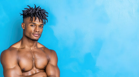 A Confident man with muscular build against blue background