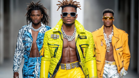 A Hip hop fashion runway show featuring stylish models in vibrant outfits